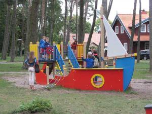Im Ferienhaus befindet sich eine Galerie mit Bildern bekannter litauischer und deutscher Künstler. Im Obergeschoss befinden sich 3 Ferienwohnungen mit jeweils 2 getrennten Schlafzimmern mit Doppelbetten, einem großen Balkon, sowie einer Küche mit Eßplatz und einem Bad.